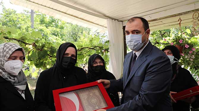 Şehidimizin ailesine Kur’an-ı Kerim ve Türk Bayrağı takdim etti.
