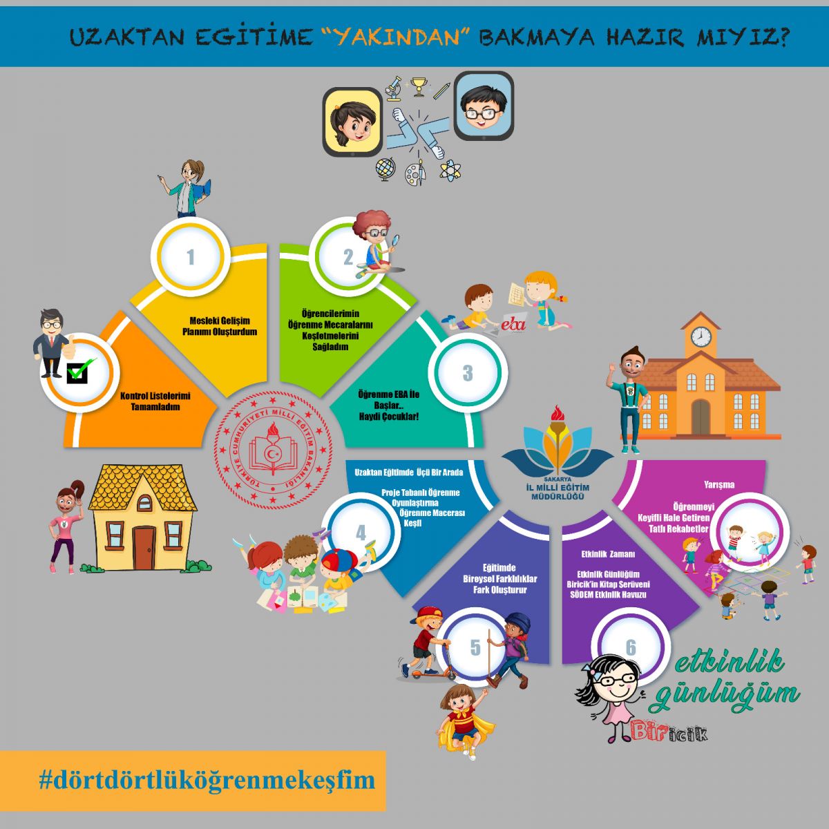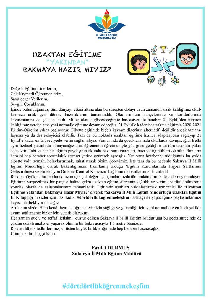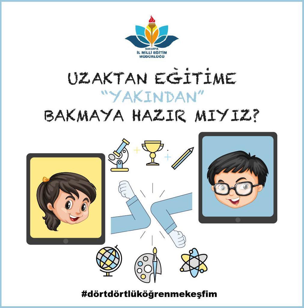 Riskten büyük tedbirler alarak bizim için çok değerli çalışmalarınızda tüm imkânlarımız ile sizlerin yanındayız. Eğitimin vazgeçilmez bir parçası hâline gelen uzaktan eğitim sürecinin sağlıklı ve verimli yürütülebilmesine yönelik olarak da çalışmalarımızı tamamladık. Eğitimde uzakları yakınlaştırmak temennisi ile ‘Uzaktan Eğitime Yakından Bakmaya Hazır mıyız?’ diyerek ‘Sakarya İl Millî Eğitim Müdürlüğü Uzaktan Eğitim el kitabını sizler için hazırladık. #dörtdörtlüköğrenmekeşfim hashtagi ile yapacağınız paylaşımlarınızı heyecanla bekliyor olacağız.