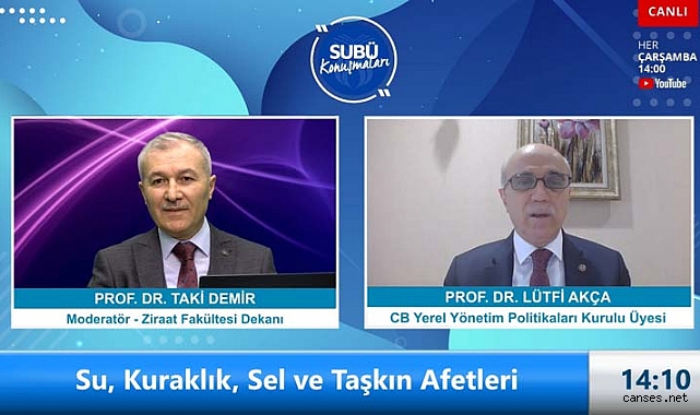 Sakarya Uygulamalı Bilimler Üniversitesi (SUBÜ) tarafından düzenlenen SUBÜ Konuşmaları’nın 45’inci konuşmacısı ‘Su, Kuraklık, Sel ve Taşkın Afetleri’ başlıklı söyleşiyle Cumhurbaşkanlığı Yerel Yönetim Politikaları Kurulu Üyesi Prof. Dr. Lütfi Akça oldu. Moderatörlüğünü Ziraat Fakültesi Dekanı Prof. Dr. Taki Demir’in üstlendiği söyleşide; Türkiye’nin su politikası, sel, taşkın ve kuraklık riskine karşı alınabilecek önlemler ile suyun tarım için önemi konuşuldu. Söyleşinin tamamı üniversitenin YouTube kanalı SUBÜ Haber’den tekrar izlenilebiliyor.