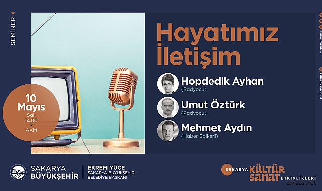 Sakarya Büyükşehir Belediyesi Mayıs Kültür Sanat Etkinlikleri ‘Hayatımız İletişim’ konulu seminer programıyla devam edecek. 10 Mayıs Salı günü AKM’de gerçekleştirilecek etkinliğe Radyocu Hopdedik Ayhan ve Umut Öztürk ile Haber Spikeri Mehmet Aydın konuşmacı olarak katılacak. 14.00’da başlayacak etkinliğe tüm kültür sanat dostları davet edilirken, programda iletişimin inceliklerine ilişkin detaylar katılımcılarla paylaşılacak.