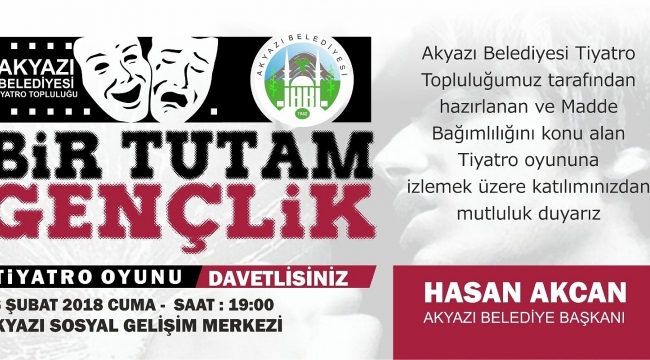 Akyazı Belediyesinin Sosyal Sorumluluk Projesi olarak başlattığı Madde bağımlığına mücadele çerçevesinde bir adım daha. Madde bağımlılığı yüzünden birçok gencin hayattan koptuğu günümüzde, 57 kişiden oluşan Akyazı Belediyesi tiyatro topluluğu madde bağımlılığının sebeplerini, sonuçlarını ve önemini vurgulayan teker teker aşamalarını gösteren gençlerin yok oluşlarını anlatan hem güldürüp hem de ders veren tiyatro oyunu sahne alıyor. Akyazı Belediyesi personeli Furkan Özel’in yazıp ve yönettiği “Bir Tutam Gençlik” adlı tiyatro oyunu Akyazı Sosyal Gelişim Merkezi Tiyatro Salonunda 16 Şubat 2018 Cuma günü saat 19.00 sahne alacak.