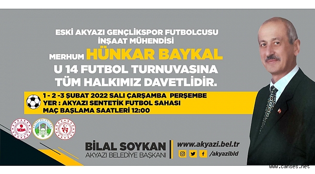 Akyazı Kaymakamlığı, Akyazı Belediyesi ve Gençlik Spor İlçe Müdürlüğü tarafından eski Akyazı Gençlikspor Futbolcusu Merhum Hünkar Baykal anısına futbol turnuvası düzenlenecek.