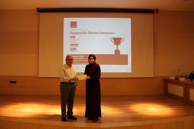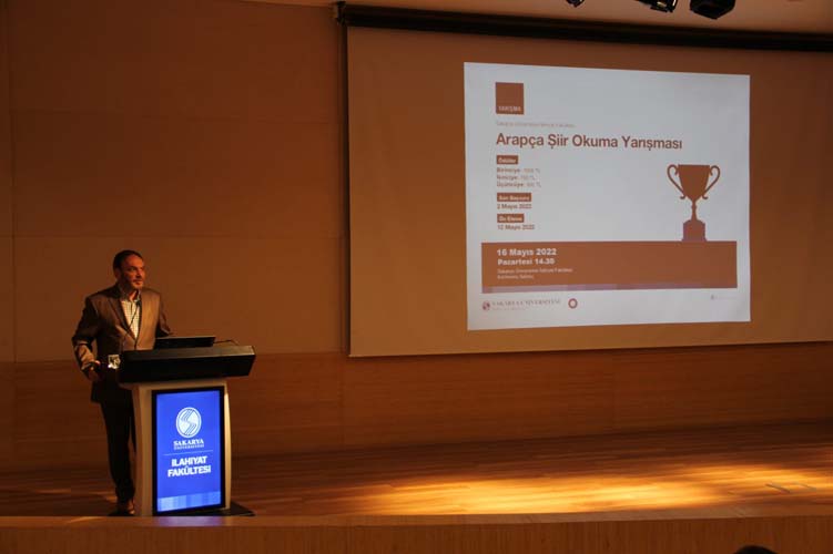 Programın açılışında konuşan İlahiyat Fakültesi Dekan Yardımcısı Dr. Şükrü Şirin, Arapça Şiir Okuma Yarışması’nın geleneksel bir niteliğe büründüğünü, pandemi sebebiyle ara verildiğini, bu yıl itibariyle de tekrar devam edilmeye başlandığını belirtti. Yarışmaya ana dili Arapça olan öğrencilerin de katıldığını hatırlatan Dr. Şükrü Şirin, Arapçayı fakültede öğrenip ana dili Arapça olanlarda birlikte Arapça Şiir Okuma Yarışma ’sına katılmalarının bile tek başına bir başarı olduğunu vurguladı. Tüm yarışmacıları tebrik edip başarılar dileyen Dr. Şükrü Şirin, programda emeği geçen tüm hoca ve öğrencilere teşekkürlerini sunarak konuşmasını sonlandırdı.