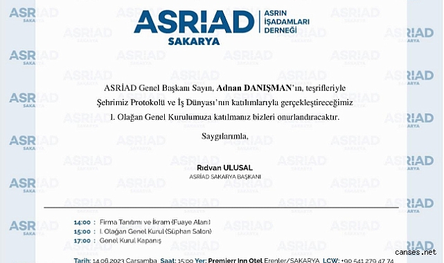 ASRİAD (Asrın İŞ Adamları Derneği) Sakarya Şube Başkanı Rıdvan Ulusal; “ ASRİAD Sakarya Şubemizin 1. Olağan Genel Kurulu Genel Başkanımız Sayın, Adnan Danışman'ın, teşrifleriyle birlikte Şehrimizin protokolü ve iş dünyasının katılımı ile gerçekleştireceğiz. 14 Haziran Çarşamba günü Saat: 15:00’te başlayacak Genel kurulumuz, Erenler İlçesin de hizmet veren Premierr Inn Otel’de gerçekleşecek.” dedi.