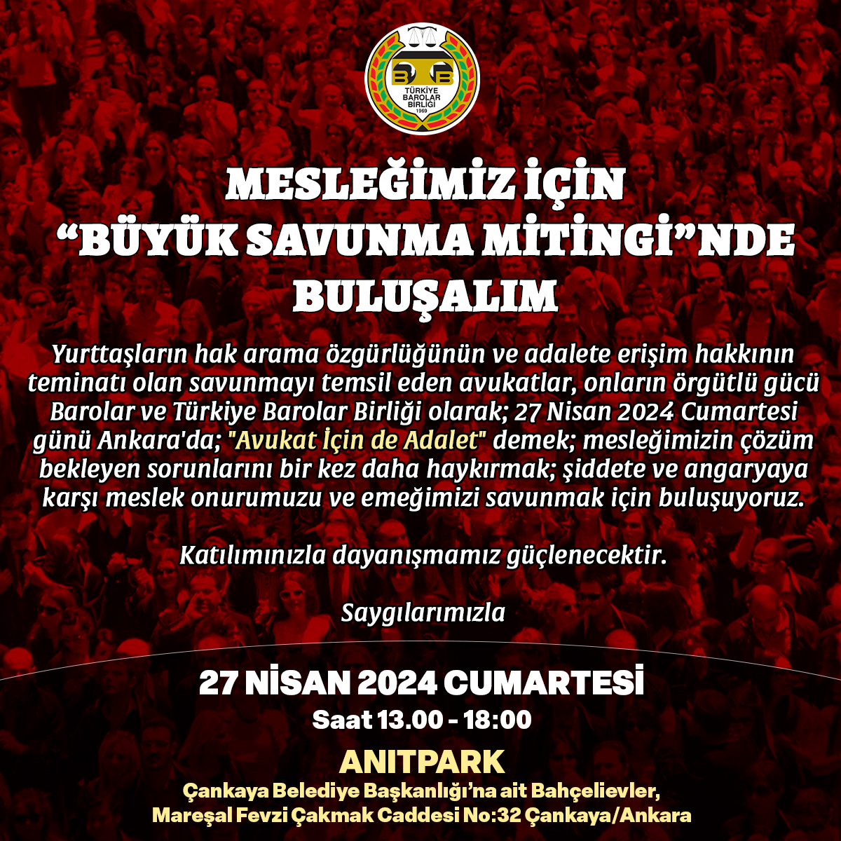 “Yurttaşların hak arama özgürlüğünün ve adalete erişim hakkının teminatı olan savunmayı temsil eden avukatlar, onların örgütlü gücü Barolar ve Türkiye Barolar Birliği olarak; 27 Nisan 2024 Cumartesi günü Ankara'da; "Avukat İçin de Adalet" demek; mesleğimizin çözüm bekleyen sorunlarını bir kez daha haykırmak; şiddete ve angaryaya karşı meslek onurumuzu ve emeğimizi savunmak için buluşuyoruz. Katılımınızla dayanışmamız güçlenecektir. Saygılarımızla."