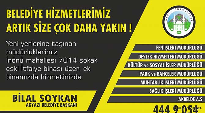 İnönü Mahallesi 7014 Sokak Eski İtfaiye Binasında Akyazı Belediyesi Ek Hizmet biriminde şu müdürlükler hizmet vermektedir;