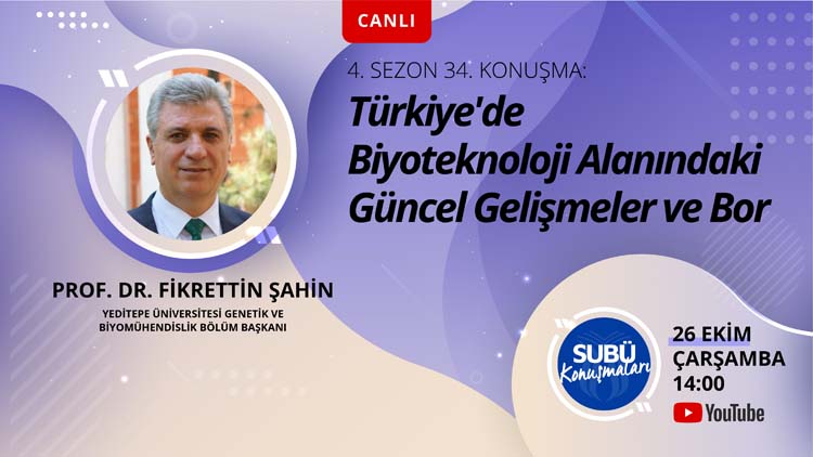 Sakarya Uygulamalı Bilimler Üniversitesi (SUBÜ) tarafından düzenlenen SUBÜ Konuşmaları’nın 34’üncü konuşmacısı İlim Yayma Büyük Ödülü sahibi ve Yeditepe Üniversitesi Genetik ve Biyomühendislik Bölüm Başkanı Prof. Dr. Fikrettin Şahin oldu. Moderatörlüğünü Biyomedikal Teknolojiler Uygulama ve Araştırma Merkezi Müdürü Doç. Dr. Mustafa Zahid Yıldız’ın yaptığı söyleşide ‘Türkiye’de Biyoteknoloji Alanındaki Güncel Gelişmeler ve Bor’ başlığı konuşuldu. Söyleşide biyoteknolojinin tarihi, günümüzde Türkiye’deki uygulamaları ve yapılan çalışmalar, bor alanındaki yenilikler, bor temelli olarak üretilen ürünler ve bu alanın geleceği konuşuldu. İzleyicilerden gelen soruları da yanıtlayan Şahin, birçok çalışmanın müjdesini verdi.