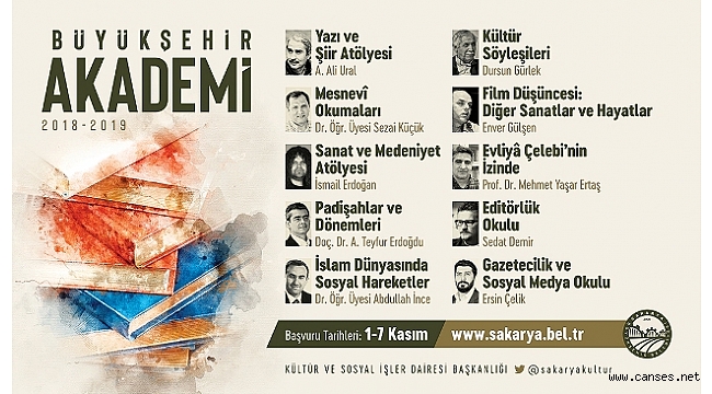Sakarya Büyükşehir Belediyesi tarafından düzenlenen Büyükşehir Akademi’de kayıtlar devam ediyor. Devam eden kayıtlar hakkında açıklamalarda bulunan Kültür ve Sanat Şube Müdürü Adem Turan, yeni dönemde Alicanlar Konağı’nda gerçekleştirilecek Büyükşehir Akademi kayıtlarının kurumsal internet sayfası (www.sakarya.bel.tr) üzerinden 7 Kasım Çarşamba gününe kadar devam edeceğini belirtti.