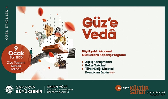 Sakarya Büyükşehir Belediyesi tarafından düzenlenen Büyükşehir Akademi’de güz sezonu 9 Ocak Salı günü düzenlenecek kapanış programıyla son bulacak. Ziya Taşkent Konser Salonu’nda gerçekleştirilecek kapanış programında kursiyerler belgelerini alacak ve Şef Kemalcan Ergün’ün sahne alacağı Türk Müziği dinletisi sunulacak.