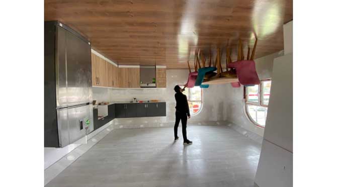 Sakarya Büyükşehir Belediyesi tarafından Millet Bahçesi’nin içerisinde yapımına başlanan Ters Ev projesinde sona gelindi. Kaba inşaatı tamamlanan projenin içerisinde montaj çalışmaları devam ediyor. Önümüzdeki haftalarda tamamlanacak mobilya ve aksesuar montajının ardından yapılacak çevre düzenlemesinin ile Ters Ev vatandaşların hizmetine sunulacak. Toplam 300 metrekare alan içerisine inşa edilen 190 metrelik Ters Ev şehrin sosyal yaşantısına katkı sağlayacak. Çalışmalarla ilgili kurum tarafından yapılan açıklamada, “ Vatandaşlarımızı önümüzdeki haftalarda yeni bir sosyal alanla daha kavuşturacağız. Evin içerisinde devam eden montaj çalışmalarının ardından yapılacak çevre düzenlemesiyle açılışımızı gerçekleştireceğiz. Şehir içinden ve şehir dışından gelecek misafirlerimizin şimdiden keyifli vakitler geçirmesini temenni ediyoruz” ifadeleri kullanıldı.