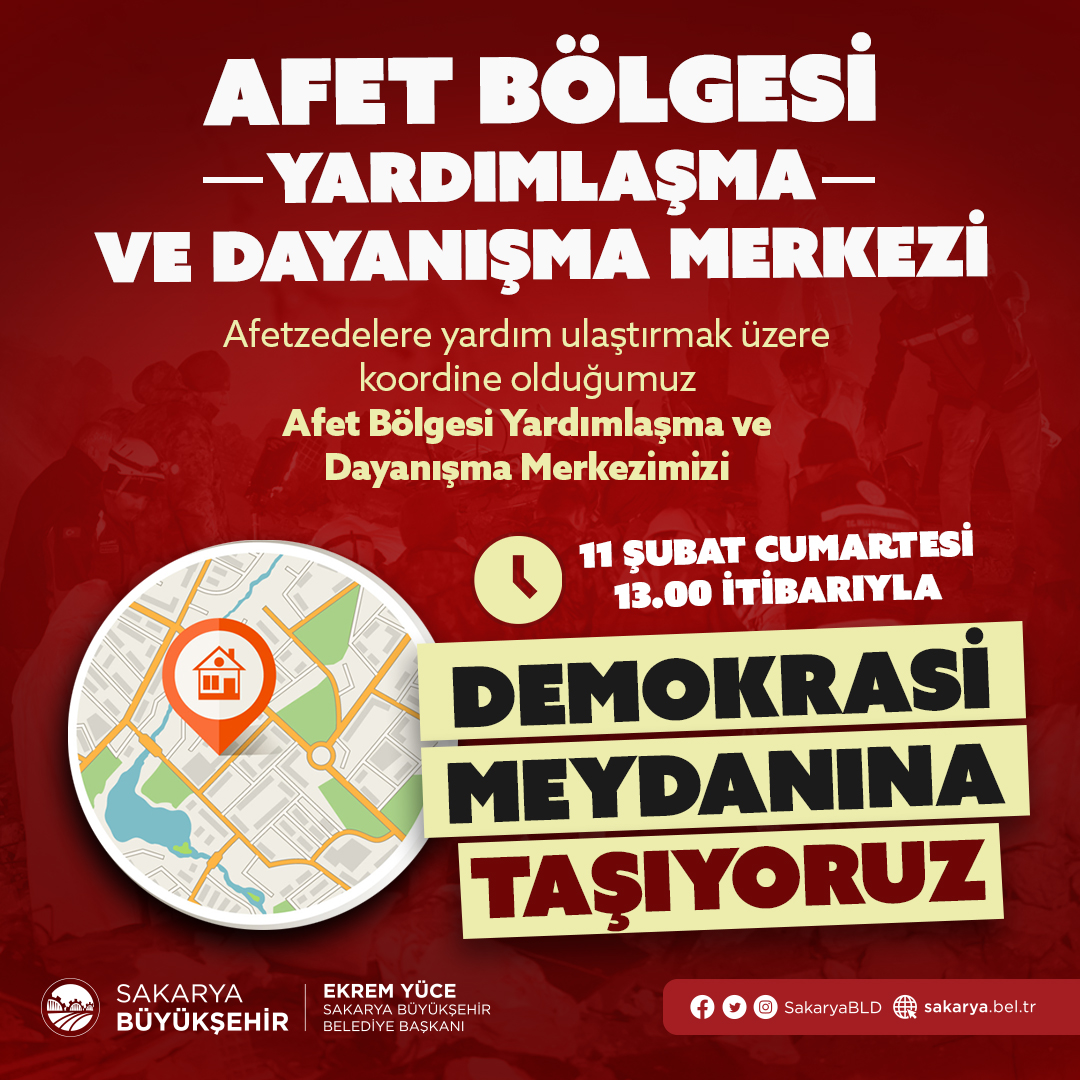 Büyükşehir Belediyesi'nden konuyla ilgili yapılan açıklama şöyle: "Asrın felaketi olarak nitelendirilen iki büyük depremin meydana geldiği andan itibaren afet bölgesindeki depremzedelere yardım toplanması adına seferberlik başlattık. Sakarya'nın dört bir yanından binlerce kişi yardım için bizimle el ele verdi ve kampanyamız 5'inci güne gelindiğinde güçlü bir desteğe dönüştü. Vatandaşlarımızın yardımları daha kolay ulaştırması ve daha büyük bir merkez oluşturulması adına Kent Park'ın arkasında bulunan SASKİ İdari Birimler Deposu'nda kurduğumuz merkezimizi 11 Şubat saat 13.00'dan itibaren 15 Temmuz Demokrasi Meydanı'na taşıyoruz. Yardım faaliyetlerine destek vermek isteyen ve ihtiyaç malzemelerini ulaştırmak için bize destek veren tüm vatandaşlarımızı yarından itibaren meydandaki merkezimize bekliyoruz. Şimdi birlik ve beraberlik zamanı. Bize güç katan tüm hemşerilerimize şükranlarımızı sunuyoruz"