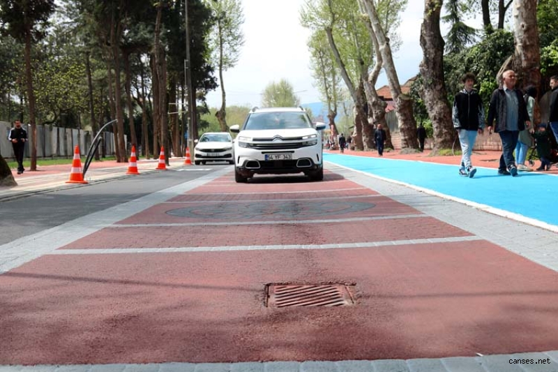 Yol Bakım ve Altyapı Koordinasyon Dairesi, Park Bahçeler Dairesi ve Fen İşleri Dairesi ekiplerinin ortak çalıştığı cadde kırmızı ve mavi renklere boyanırken, bölgede Sakarya'da ilk kez uygulanan 'baskı asfalt' işlemi uygulandı.