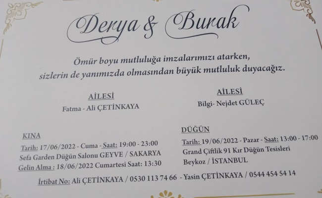 Sigortacılık ve bankacılık alanında hizmet veren farklı kuruluşlarda üst düzey yönetici olarak görev yapan Derya Çetinkaya ve Burak Güleç çiftinin düğün töreni ise 19 Haziran Pazar günü İstanbul Beykoz’daki Grand Çiftlik 91 Kır Düğün Tesislerinde saat 13.00-17.00 arasında yapılacak.