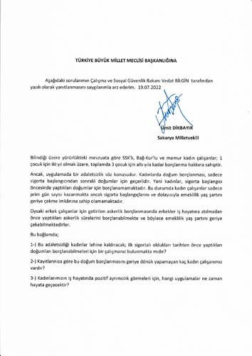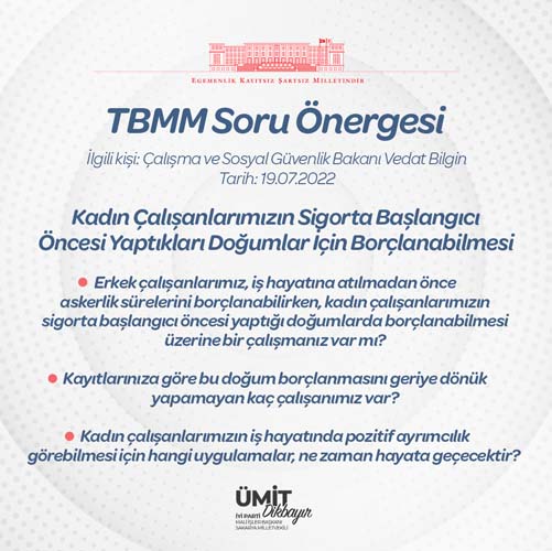 İYİ Parti Genel Başkan Yardımcısı ve Sakarya Milletvekili Ümit Dikbayır, Çalışma ve Sosyal Güvenlik Bakanı Vedat Bilgin’e yanıtlaması istemiyle bir soru önergesinde bulundu. Dikbayır, erkeklere iş hayatına atılmadan askerlik yapıp askerlik borçlanması imkânı sağlanırken, kadın çalışanların sigortalı olmadan önce yaptığı doğumlarda borçlanabilmesine dair bir çalışma olup olmadığını Meclise sunduğu yazılı önergede belirtti.