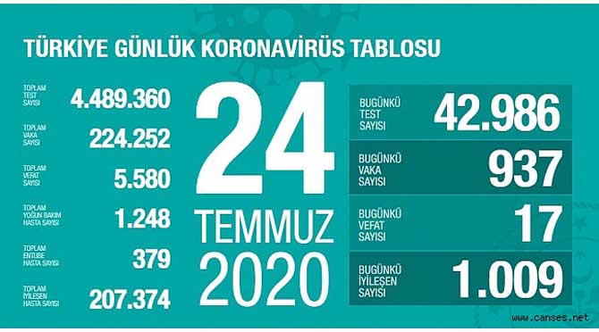 Sağlık Bakanı Fahrettin Koca, Türkiye'deki corona virüsü salgınıyla ilgili güncel verileri açıkladı. 24 Temmuz Cuma gününün tablosuna göre, son 24 saatte 17 kişinin hayatını kaybetmesi sonucu can kaybı 5 bin 580 oldu. Vaka sayısı da 937 artarak 224 bin 252'ye yükseldi. Sosyal medya hesabından güncel verilere ilişkin değerlendirmelerde bulunan Bakan Koca, "Toplam test sayımız 4,5 milyona yaklaştı. İyileşen hasta sayımızla yeni vaka sayımız arasındaki fark, düne kıyasla azaldı" ifadesini kullandı.