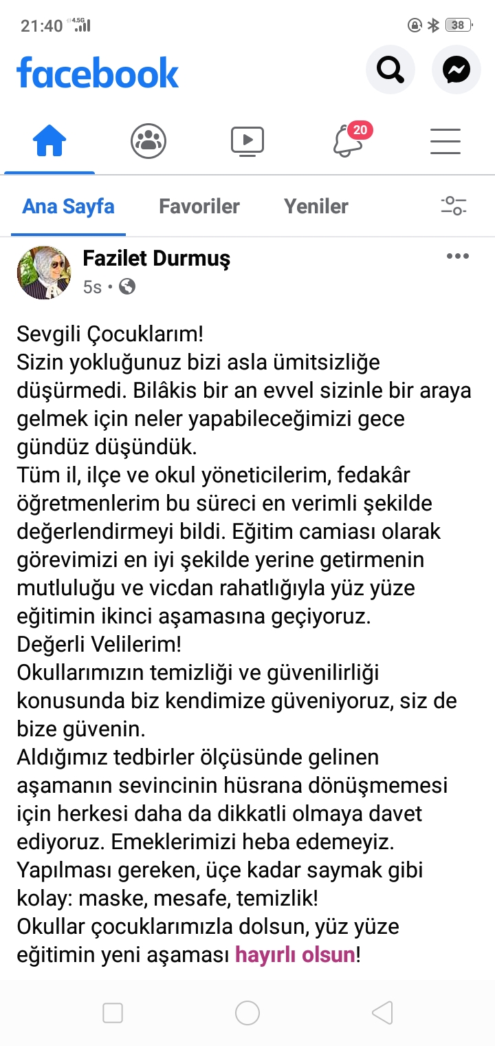 Tüm il, ilçe ve okul yöneticilerim, fedakâr öğretmenlerim bu süreci en verimli şekilde değerlendirmeyi bildi. Eğitim camiası olarak görevimizi en iyi şekilde yerine getirmenin mutluluğu ve vicdan rahatlığıyla yüz yüze eğitimin ikinci aşamasına geçiyoruz.