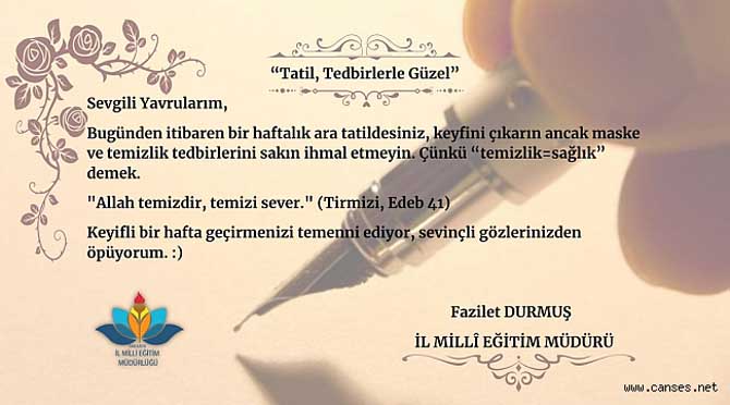 İl Millî Eğitim Müdürü Fazilet Durmuş, sosyal medya hesaplarından pazartesi günleri yayımlanan mesajında ara tatile çıkan öğrencilere koronavirüs tedbirleriyle ilgili tavsiyelerde bulundu.