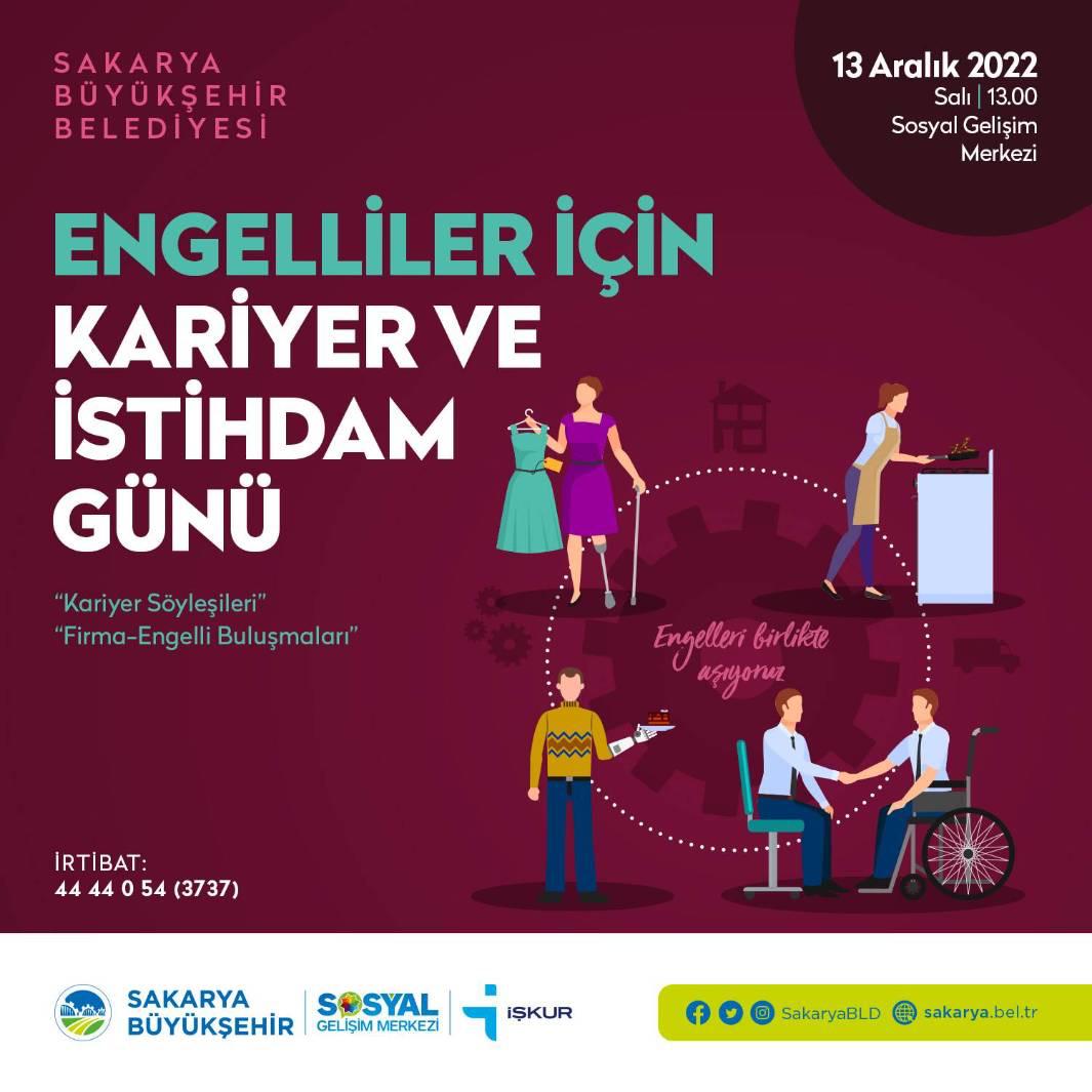 Sakarya Büyükşehir Belediyesi Sosyal Hizmetler Dairesi Başkanlığı Engelli Hizmetleri Şube Müdürlüğü tarafından engelli bireylere yönelik çalışmalar devam ediyor. Büyükşehir Belediyesi ve İŞKUR iş birliğiyle hayata geçirilecek ‘Kariyer ve İstihdam Günü’ 13 Aralık Salı günü Sosyal Gelişim Merkezi’nde gerçekleştirilecek.