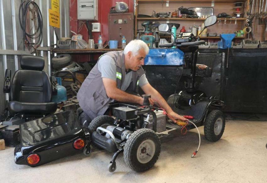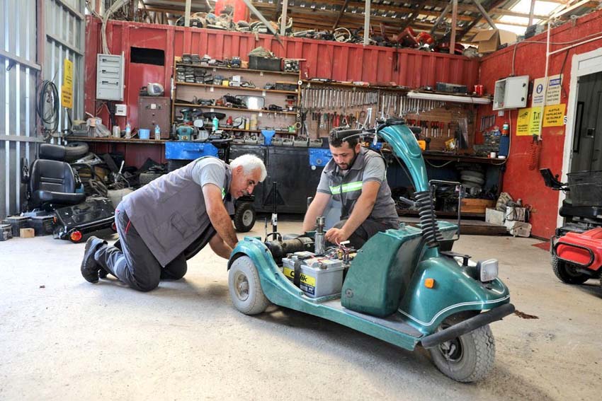 Dağdibi Mahallesi’ndeki Teknik Birimler Şantiyesinde bulunan tamir ve bakım atölyesinde, parçaları bulunan engelli araçlar hemen gününde tamir edilerek engelli vatandaşların evine teslim ediliyor. Parçası olmayan araçlarda temin süresi dâhilinde çalışma yapılarak ilgili sorun hızla çözülüyor. İlçelerde ve il dışında bozulan araçlar ise ilgili belediyeler tarafından bakım atölyesine ulaştırılarak bakımı yapılıyor. Atölyenin ayrıca engelli vatandaşlara bulunduğu yerde hizmet sunan bir aracı da bulunuyor.