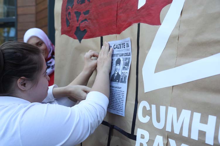 Engelsiz yürekler 29 Ekim’e hazırlanmak için günler öncesinden çalışmalara başladı. Tasarım ve okuma-yazma sınıfı öğrencileri ‘29 Ekim Gazetesi’ çıkarmak için kolları sıvadı. Çıkarmış oldukları gazetelere kupür hazırlayan öğrenciler, coşkulu bayram havasını tüm katılanlara ulaştırdı. Engelli bireyler mutfak sınıfında yaptıkları kurabiyeleri katılımcılara ikram ederek becerikli ellerin marifetlerini göstermiş oldu. Ritim Pandomim sınıfı öğrencileri ise pandomim gösterisi ile katılım sağlayan vatandaşları karşıladı. Program sonunda öğrenciler Türk Bayrağı dağıttı.
