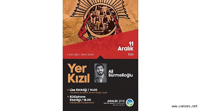 Sakarya Büyükşehir Belediyesi Aralık Kültür Sanat Etkinlikleri, 11 Aralık Salı günü gerçekleştirilecek ‘Yer Kızıl’ kitabının söyleşi ve imza günü programı ile devam edecek. Yazar Ali Sürmelioğlu’nun kaleme aldığı ‘Yer Kızıl’ isimli eser iki farklı yerde konuşulacak. İlk olarak saat 14.00’da Serdivan Anadolu İmam Hatip Lisesi öğrencileriyle bir araya gelecek olan Sürmelioğlu, saat 18.00’da Faik Baysal Kütüphanesi’nde kültür sanat dostlarıyla buluşacak. Kültür ve Sosyal İşler Dairesi Başkanlığı’ndan yapılan açıklamada, “Yazar Ali Sürmelioğlu’nun ‘Yer Kızıl’ isimli kitabının konuşulacağı söyleşi ve imza günü etkinliğimize tüm kültür sanat dostları davetlidir” denildi.