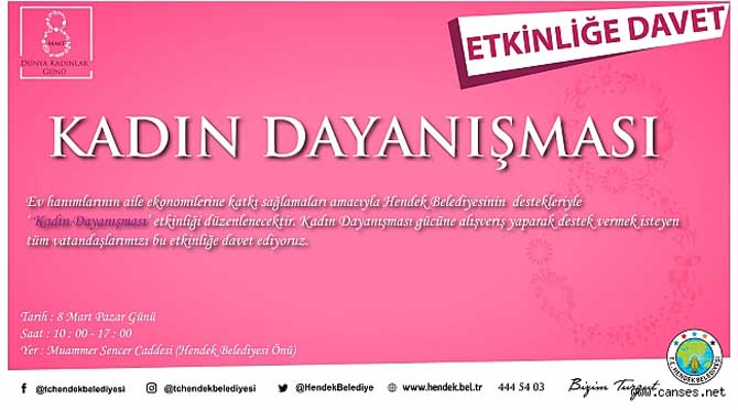 Hendek Belediyesi 8 Mart Dünya Kadınlar Günü nedeniyle, aile ekonomilerine katkı sağlamak isteyen ev kadınları için, “Kadın Dayanışması” etkinliği düzenliyor.