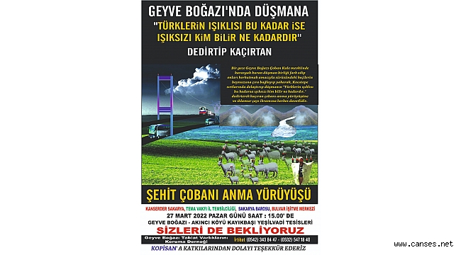 KANSERDER Sakarya, TEMA Vakfı Sakarya İl Temsilciliği, Sakarya Barosu ve Bulvar İşitme Merkezinin destek verdiği doğa yürüyüşüne tüm Sakaryalıları davet eden Geyve Boğazı Tabiat Varlıklarını Koruma Derneği yöneticileri etkinlikle ilgili açıklamalarında; “Kurtuluş Savaşı'nda Yunan birliklerinin işgal ettiği Geyve Boğazı yöresinde bir gece Çoban Kale mevkiinde karargâh kuran düşman birliğini fark edip onları korkutmak amacıyla sürüsündeki keçilerin boynuzuna çıra bağlayıp yakarak, Kocatepe sırtlarında dolaştırıp düşmanın “Türklerin ışıklısı bu kadarsa ışıksızı kim bilir ne kadardır” dedirterek kaçıran çobanı anma yürüyüşüne ve ıhlamur çayı ikramına herkes davetlidir. Etkinliğimiz 27 Mart 2022 Pazar Günü Saat 15.00’de Geyve Boğazı Akıncı Köyü Kayıkbaşı Yeşilvadi Tesisleri bölgesinde yapılacaktır.” ifadelerine yer verdiler.