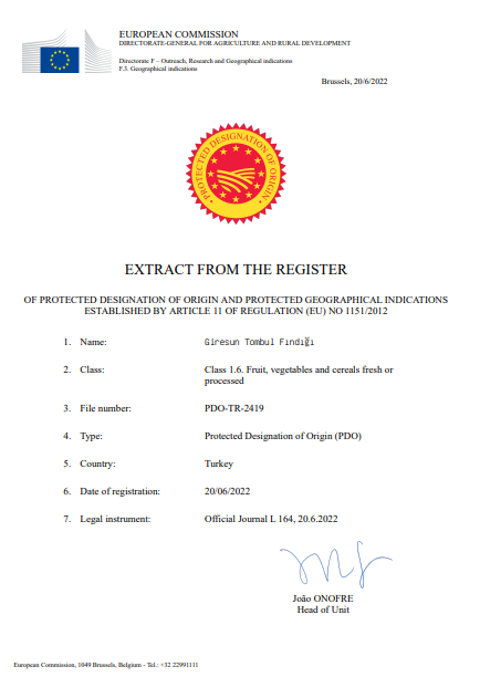 Avrupa Birliği (AB) Komisyonunda tescil edilerek ülkemizi temsil eden 8 inci ürünümüz Giresun Tombul Fındığı, aynı zamanda menşe adı ile korunan 7 inci coğrafi işaretli ürünümüz olarak Avrupa Birliği Komisyonu kayıtlarında yerini almıştır.