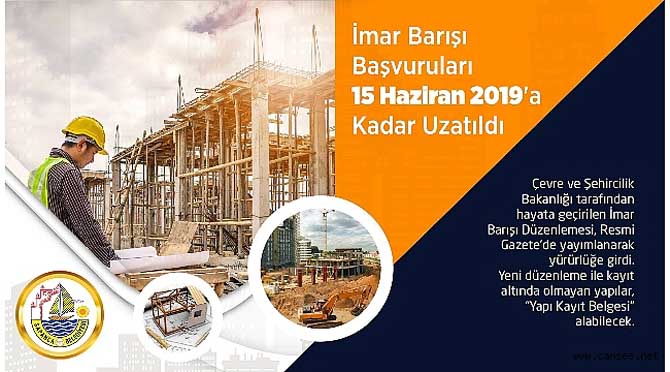 Vatandaşın imara aykırı, ruhsatsız veya ruhsat eklerine aykırı yapıların kayıt altına alınması yoluyla bu yapılara yasallık kazandırılmasının hedeflendiği "İmar Barışı" müracaatları, başvuru süresinin son günlerinde vatandaşların yoğun ilgisiyle karşılaşıldı ve bu nedenle 15Haziran 2019 tahinide kadar uzatıldı.