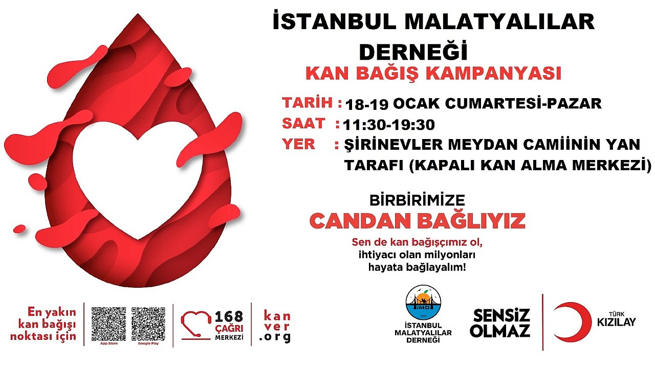 Web: www.istanbulmalatyalilardernegi.org“Birbirimize Candan Bağlıyız” sloganı ile yola çıkıldıKampanya kapsamında kullanılan “Birbirimize Candan Bağlıyız” sloganı ile kan bağışının toplumsal dayanışmadaki önemine dikkat çekiliyor. Dernek yetkilileri, tüm duyarlı vatandaşları kampanyaya katılmaya davet etti.