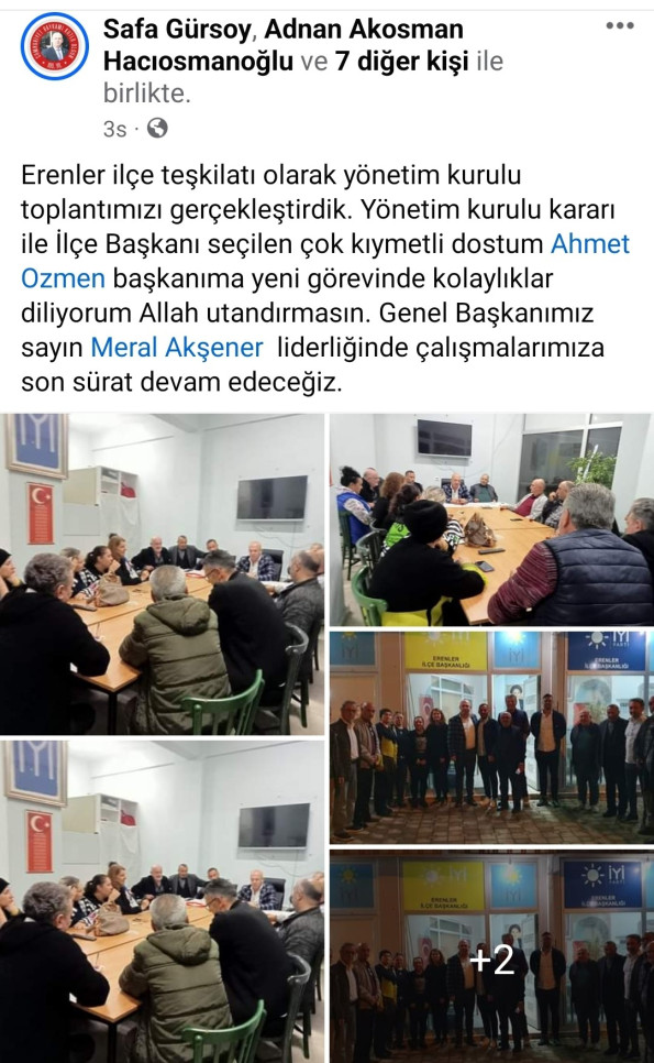 İYİ Parti Erenler de sular durulmuyor daha önce ilçe başkanlığı seçimi sürecinde ilçeye mevcut il başkanı tarafından atanan Safa GÜRSOY'a karşı ilçe kendi adayını çıkaracaktı fakat mevcut il başkanı tarafından yapılan baskılar seçilseniz de görevden alırım Genel Merkezin 'in talimatı böyle gibi söylemler ile aday kişi hem adaylıktan vazgeçirildiği gibi partiden de istifa etmek zorunda bırakıldı.