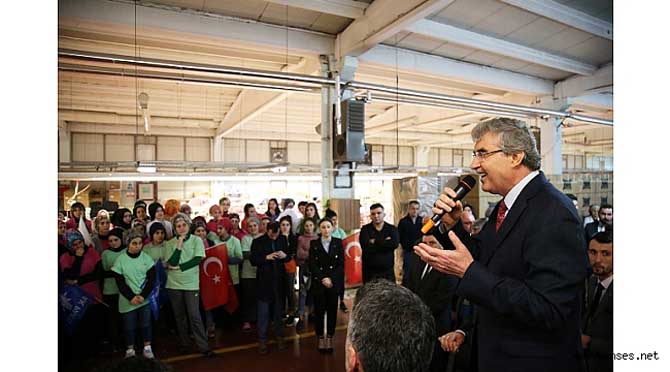 Nazik davetleri dolayısıyla müessese sahiplerine teşekkür ederek sözlerine başlayan Başkan Adayı Ekrem Yüce, “Fabrikamızda kadın istihdamının yoğun olmasına çok sevindik. İnşallah bizler de kadınların istihdamına yönelik adımlar atacak, destekler sunacağız. Şimdi önemli bir seçim arifesindeyiz. Ülkemizin bekası ve istikrarı, muasır medeniyetler seviyesine çıkması için inşallah bu seçimleri sizlerin destekleriyle başarılı bir şekilde tamamlayacağız. Milletimiz ve memleketimiz için aşk ile koşmaya devam edeceğiz” dedi.