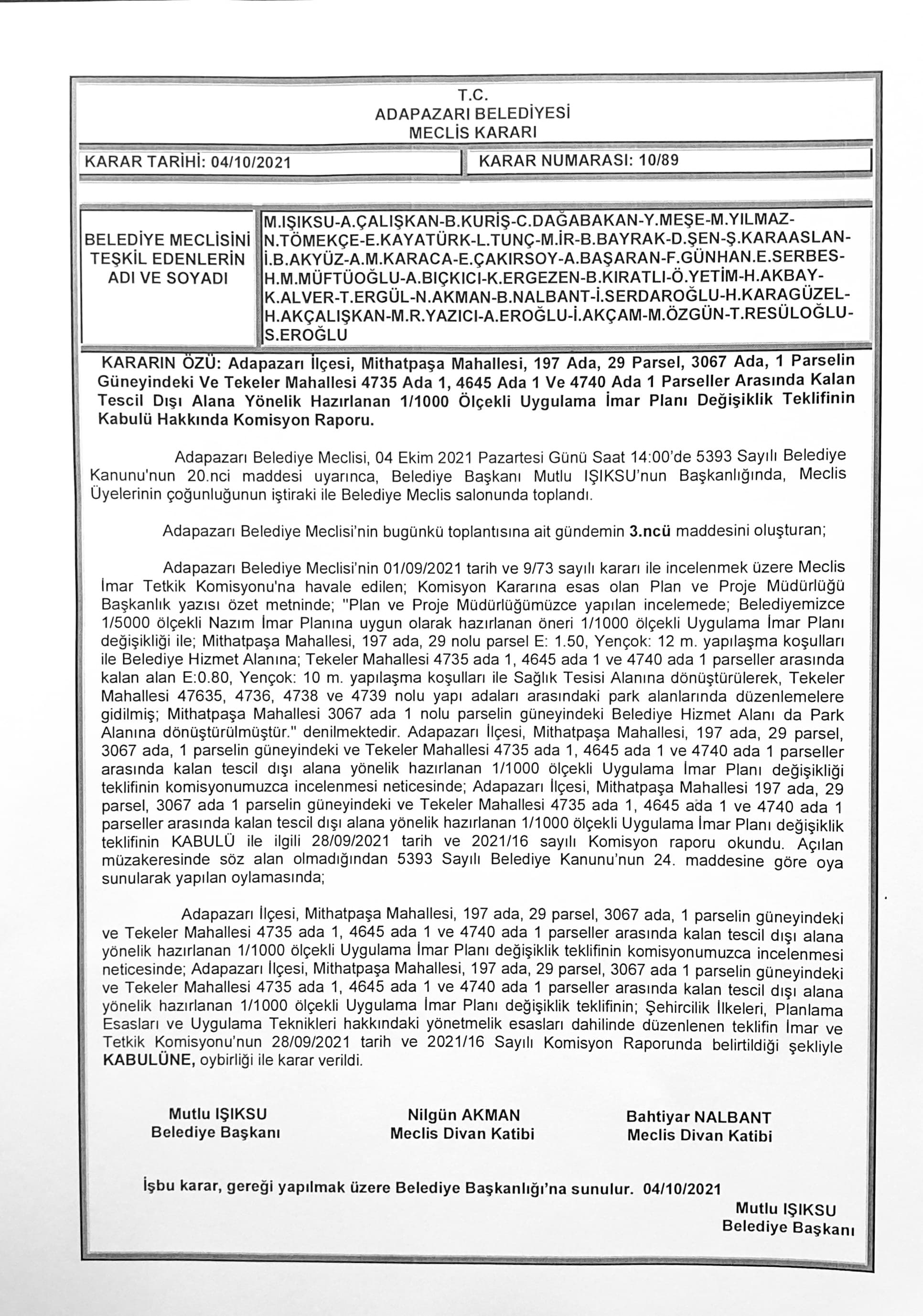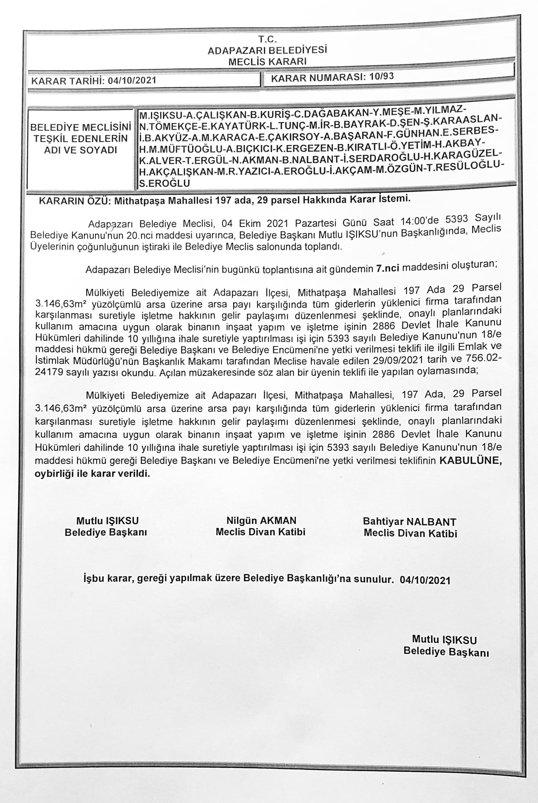 - 04 Ekim 2021 tarihli Adapazarı Belediyesi meclis toplantısında, meclis gündeminin 3’üncü maddesinde yer alan, Meserret Bahçe Sosyal Tesisleri’nin bulunduğu alanın Belediye Hizmet Alanına çevrilmesi teklifini içeren İmar Komisyonu raporu, o dönem Adapazarı Belediyesi Meclis Üyesi olan ve şu anda CHP Adapazarı İlçe Başkanlığı görevinde bulunan Sayın Haluk Akbay’ın da kabul oyu vermesi neticesinde oybirliği ile kabul edilmiştir.