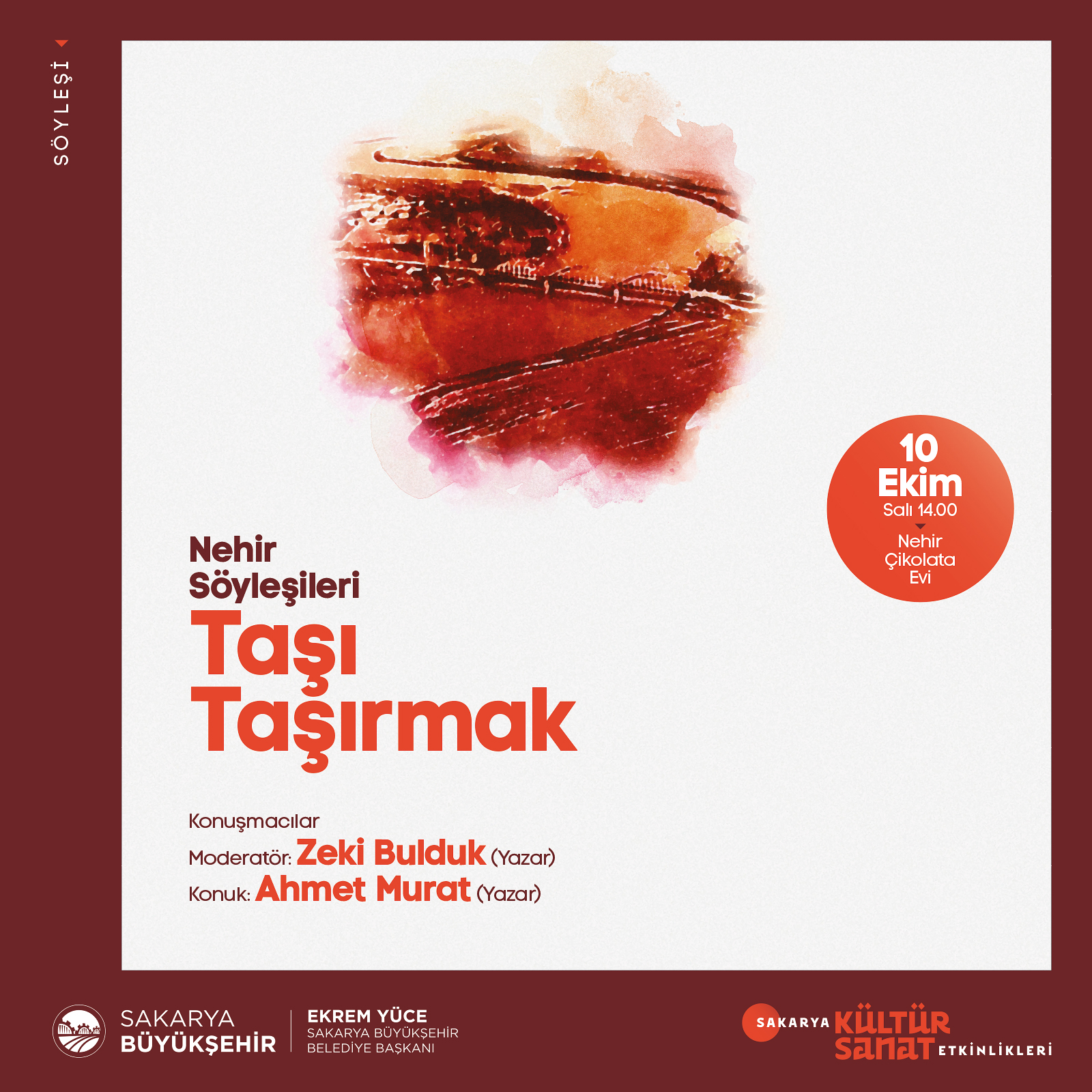 Sakarya Büyükşehir Belediyesi Ekim kültür sanat etkinlikleri Nehir Söyleşileri kapsamında ‘Taşı Taşırmak’ isimli programla devam edecek. 10 Ekim Salı günü Nehir Çikolata Evi’nde gerçekleştirilecek etkinliğin moderatörlüğünü Yazar Zeki Bulduk üstlenecek. Yazar Ahmet Murat ise etkinliğe konuşmacı olarak katılacak.