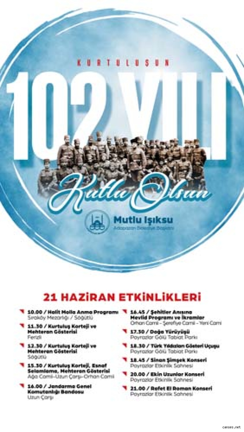 Adapazarı’nın Düşman İşgalinden Kurtuluşunun 102’nci yılı, 21 Haziran tarihinde Adapazarı Belediyesi’nin organizasyonu ile birçok etkinlikte coşkuyla kutlanacak. Söğütlü ve Ferizli Belediyelerinin birlikte düzenledikleri programda, kurtuluş kahramanlarından Halit Molla’nın Söğütlü Sıraköy Mezarlığı’ndaki Anma Programı ile başlayacak etkinlikler, Ferizli Belediyesi’nin Ferizli ilçe merkezinde, Söğütlü Belediyesinin Söğütlü ilçe merkezinde düzenleyecekleri kurtuluş kortejleri ve mehteran gösterileri ile devam edecek. Adapazarı Belediyesi’nin Tarihi Uzunçarşı’da düzenleyeceği Kurtuluş Kortejleri ile esnaf selamlaması ve Mehteran Gösterileri ile sürecek etkinlikler kapsamında, Jandarma Genel Komutanlığı Bandosu, Tarihi Uzunçarşı’da şehir insanı ile buluşacak ve ardından Orhan Camii, Şerefiye Camii ve Yeni Camii’de şehitler anısına mevlid programları ve ikramlar gerçekleştirilecek.