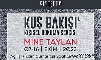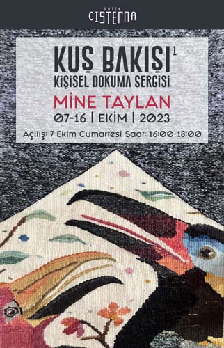 Sakarya Üniversitesi Sanat Tasarım ve Mimarlık Fakültesi Geleneksel Türk Sanatları bölümünde görev yapan Dr. Öğr. Üyesi Mine Taylan’ın doğanın sınırsız renk paletinden esinlenerek hazırladığı kişisel dokuma sergisi “Kuş Bakışı 1”, İstanbul Beyazıt’ta yer alan Antik Cisterna’da 07-16 Ekim 2023 tarihleri arasında sanatseverler ile buluşacak. Farklı tür ve renkteki kuşların geometrik formlar içinde dokuma resim (tapestry) tekniği ile tasvir edildiği serginin açılışı 07 Ekim 2023 Cumartesi günü saat 16:00’da yapılacak. Sergi 16 Ekim 2023 tarihine kadar her gün 10:00-16:00 saatleri arasında gezilebilir.