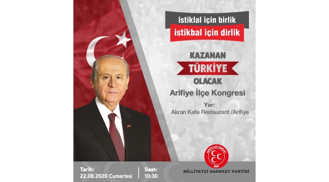 Milliyeti Hareket Partisi Arifiye İlçe Başkanlığı olarak “İstiklal için birlik, İstikbal için dirlik, kazanan Türkiye olacak” diyerek yola çıktıklarını vurgulayan MHP Arifiye İlçe Başkanı Ferit Şekerli; “Biz çıktığımız bu dava yolunda olağan kongremizi gerçekleştirme kararı almış bulunuyoruz. Kongremiz; 22 Ağustos 2020 Cumartesi günü 10:30-13:00 saatleri arasında Akran Kafe’de yapılacaktır. Kongremizin ilçemiz Arifiye’mize, Sakarya'mıza ve Türkiye'mize hayırlar getirmesini dileyerek, tüm ülküdaşlarımı, dava arkadaşlarımı ve Arifiye halkımızı davet ediyorum. Olağan kongremizin birlik ve beraberlik ile gerçekleşmesini rabbimden niyaz ediyorum” dedi. Levent CANDAN