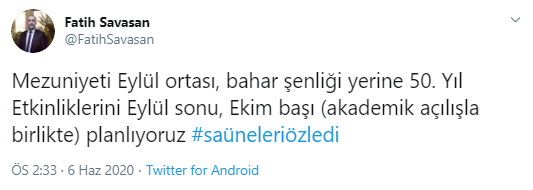 Pandemi sürecinden dolayı mezuniyet törenlerini ertelemek zorunda kaldıklarını dile getiren Rektör Prof. Dr. Savaşan, “Her yıl temmuz ayında düzenlediğimiz Mezuniyet Törenlerimizi bu yıl Eylül ayının ortasında yapma kararı aldık. Pandemi sürecinde ülkemizin yakaladığı bu başarılı ivmenin devam edeceğine inancımız tam. Bundan dolayı Eylül ayında, mezun olan öğrencilerimizi ve ailelerini üniversitemizde ağırlamak istiyoruz. Öğrencilerimizi son dönemlerinde ayrı kaldıkları üniversitelerinden özel bir mezuniyet töreni ile uğurlayacağız” dedi.