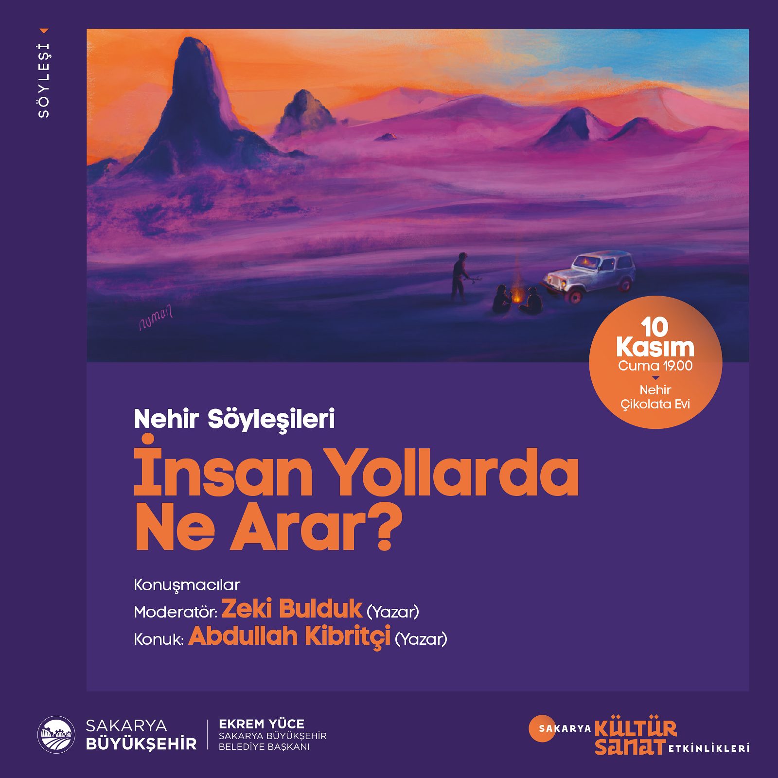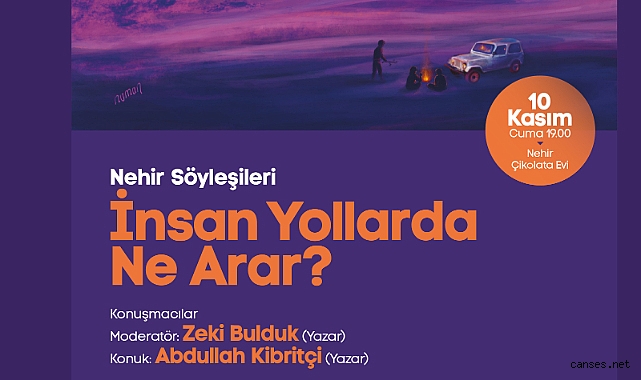 Sakarya Büyükşehir Belediyesi Kasım kültür sanat etkinlikleri ‘İnsan Yollarda Ne Arar?’ isimli söyleşi programı ile devam edecek. Nehir Söyleşileri kapsamında 10 Kasım Cuma günü Nehir Çikolata Evi’nde gerçekleştirilecek etkinliğin moderatörlüğünü Yazar Zeki Bulduk üstlenecek. Konuşmacı olarak Yazar Abdullah Kibritçi’nin katılacağı etkinlik saat 19.00’da başlayacak. Kültür ve Sosyal İşler Dairesi Başkanlığı’ndan yapılan açıklamada, “Kasım kültür sanat etkinliklerimiz kapsamında düzenleyeceğimiz ‘İnsan Yollarda Ne Arar?’ isimli söyleşiye tüm kültür sanat dostları davetlidir” denildi.