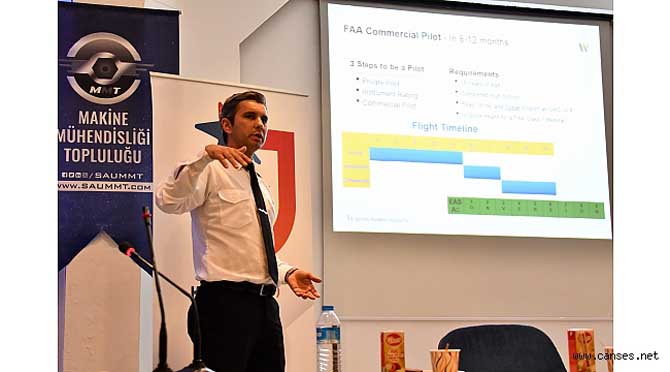 Özmeriç, sunumunun devamında öğrencilere havacılık alanında okul ve iş olanaklarından bahsetti.