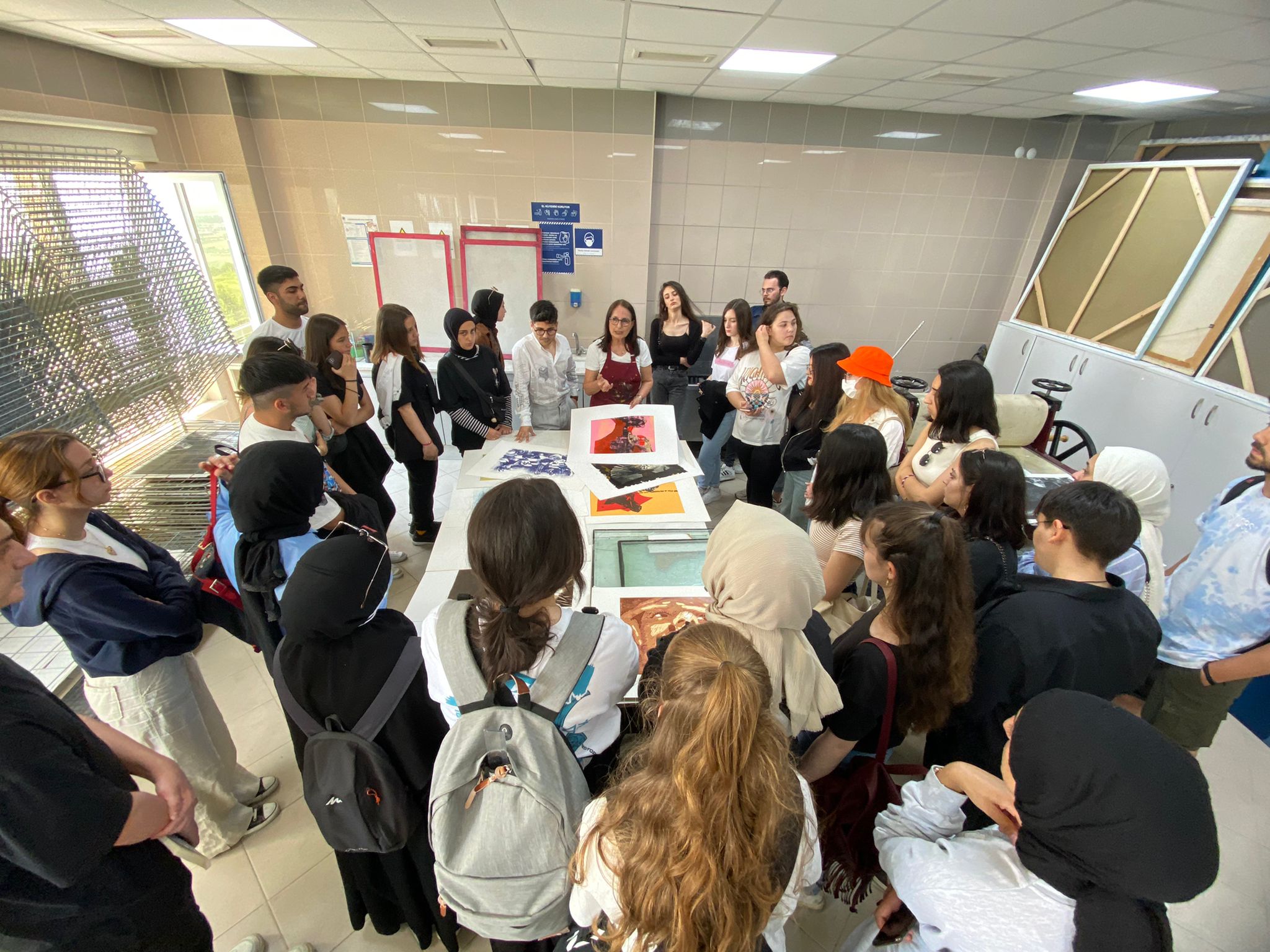 Sakarya Uygulamalı Bilimler Üniversitesi (SUBÜ) Ferizli Meslek Yüksekokulu Grafik Tasarımı Programı öğrencileri, Öğretim Görevlisi Ersin Berk mihmandarlığında Sakarya Üniversitesi (SAÜ) Sanat Tasarım ve Mimarlık Fakültesi’ne ziyarette bulundular. Düzenlenen teknik geziye Sakarya Meslek Yüksekokulu Basım ve Yayım Teknolojileri ile Halkla İlişkiler ve Tanıtım Programı öğrencileri de katılım gösterdi. Öğrenciler Güz Yarıyılında teorik olarak aldıkları baskı teknikleri dersini SAÜ Sanat Tasarım Serigrafi ve Gravür Atölyesinde pekiştirme imkânı buldu. Öğretim Görevlisi Gülay İnce’nin daha önce baskı atölyesinde yaptırdığı eserleri inceleyen öğrenciler, serigrafi baskı yapma şansına kavuştu. Teknik gezide son olarak sanat galerisinde öğretim elemanları tarafından düzenlenen seramik sergisi ziyaret edilerek sergilenen eserlerin üretim süreçleriyle ilgili aynı zamanda eser sahibi de olan fakültenin Dekan Yardımcısı Dr. Öğretim Üyesi Dicle Öney ve Öğretim Görevlisi Ayşegül Şahin’den bilgi alındı.