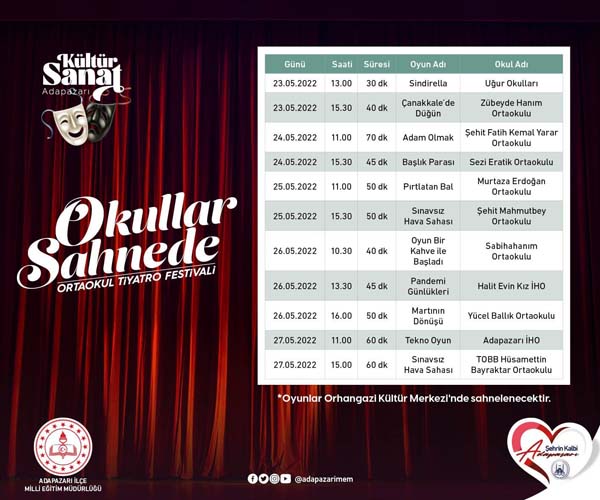 Adapazarı İlçe Milli Eğitim Müdürlüğü tarafından Adapazarı Belediyesi’nin destekleriyle, Adapazarı Belediyesi Mayıs ayı kültür ve sanat etkinlikleri kapsamında, Orhangazi Kültür Merkezi’nde düzenlenen ortaokullar arası tiyatro festivali, Adapazarı İlçe Milli Eğitim Öğretmen Tiyatro Ekibinin Kadın Masalları Çocuk Oyunu ile başladı. 23-28 Mayıs tarihleri arasında gerçekleştirilecek olan festivalde 11 farklı okul tiyatro oyunlarını sergileyecek.