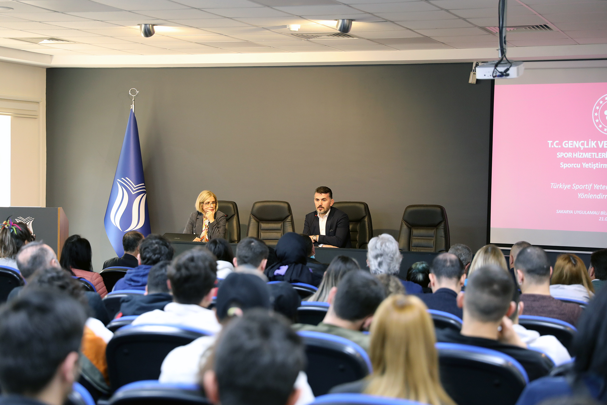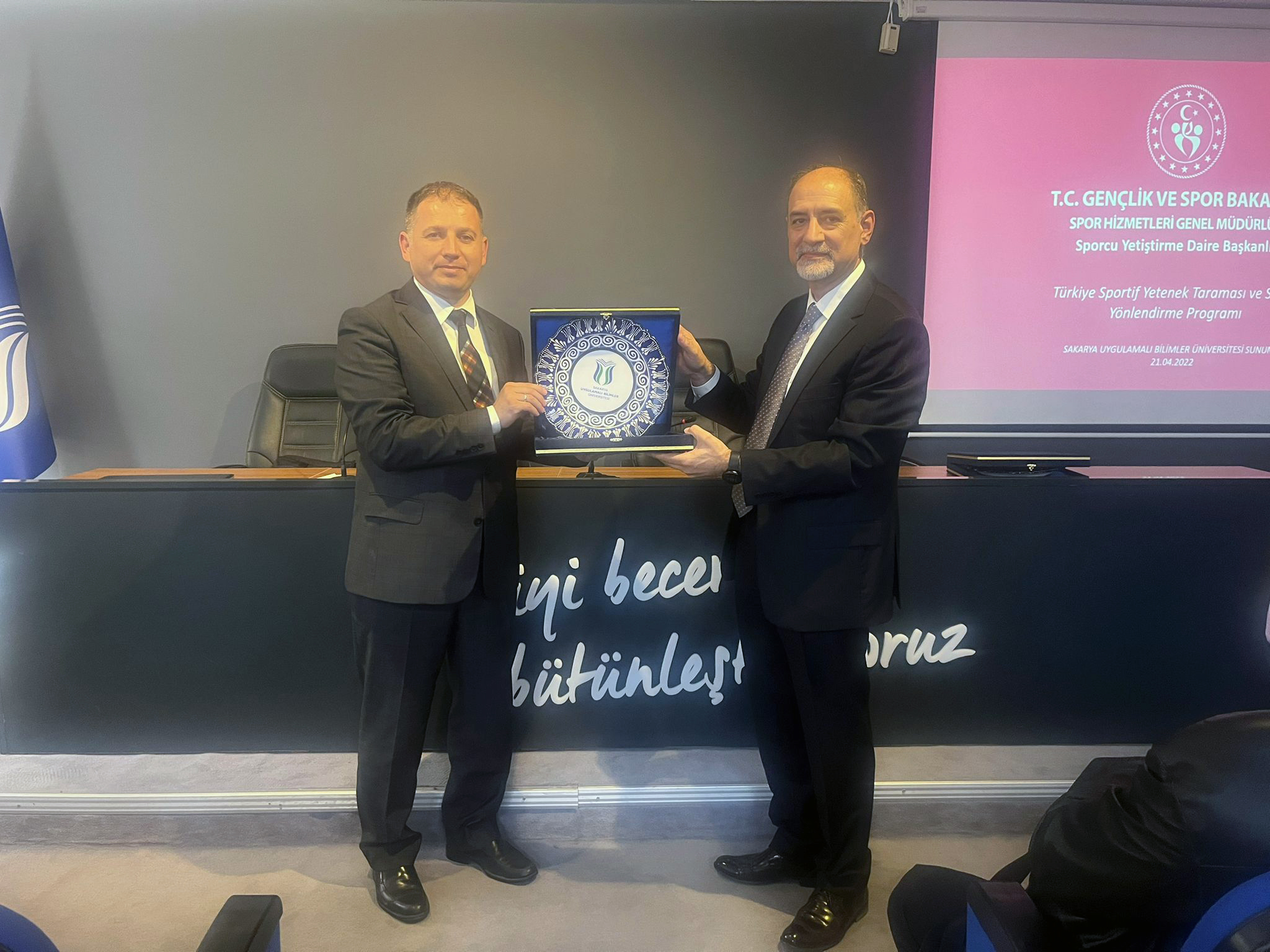 Sakarya Uygulamalı Bilimler Üniversitesi (SUBÜ) Spor Bilimleri Fakültesi tarafından ‘Performans Sporunda Yeni Vizyon: Sportif Yetenek Taraması ve Sporcu Yönlendirme Programı’ başlıklı bir söyleşi gerçekleştirildi. Moderatörlüğünü Beden Eğitimi ve Spor Öğretmenliği Bölümü Başkanı Prof. Dr. Ayşe Dilşad Mirzeoğlu’nun üstlendiği söyleşide Spor Genel Müdürlüğü Sporcu Yetiştirme Daire Başkanı Selçuk Çebi ve Şube Müdürü Fatih Konuksever öğrencilerle buluştu. Rektörlük Konferans Salonu’nda düzenlenen söyleşiyi Spor Bilimleri Fakültesi Dekanı Prof. Dr. Nevzat Mirzeoğlu, öğretim elemanları ve öğrenciler takip etti. Söyleşide sporcu kimliği geliştirme etkinlik programı, pandemi sürecindeki uzaktan eğitim, sporcu yetenek taraması, sporcu yönlendirmesi, bireylerin spora yönlendirilmesinde ailenin rolü ile Gençlik ve Spor Bakanlığı bünyesinde istihdama yönelik Spor Bilimleri Fakültesi mezunlarına öncelik verilmesi konuları konuşuldu. Söyleşinin ardından Dekan Prof. Dr. Nevzat Mirzeoğlu tarafından konuşmacılara hediye takdim edildi.