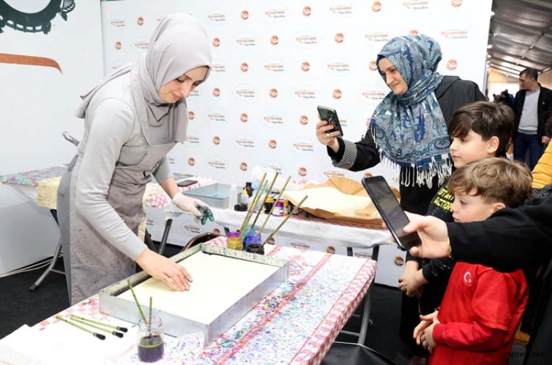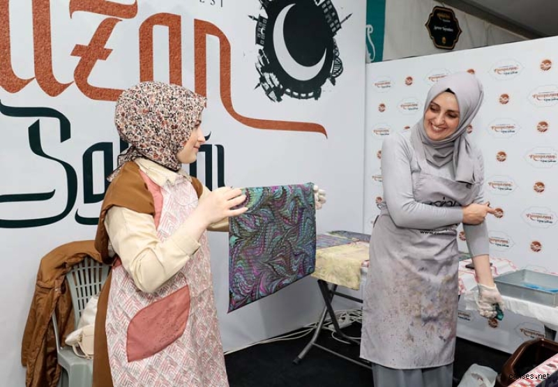 Ramazan’ın ikinci gününde de rengarenk görüntülere sahne olan sokakta geleneksel İslam-Türk sanatı olan Ebrû yapıldı, vatandaşlar adeta görsel bir şölen yaşadı. Usta ellerin hazırladığı ebru eserlerini inceleyen vatandaşlar, ellerine fırçaları alıp kitre maddesi döktü, toprak boyaları karıştırdı ve fırçalarla farklı eserler ortaya çıkardı.