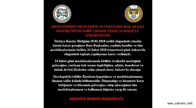 Türkiye Barolar Birliğinin 09.02.2018 tarihli olağanüstü yönetim kurulu kararı gereğince Baro Başkanları, seçilmiş kurullar ve tüm meslektaşlarımızla birlikte 24 Şubat 2018 (cumartesi) günü Ankara’da olağanüstü toplantı yapılmasına karar verilmiştir.