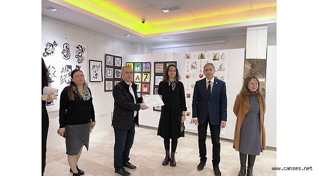 Sergiyi gezen Rektör Savaşan, serginin koordinatörü Tuba Marmara’ya teşekkür belgesi takdim etti.