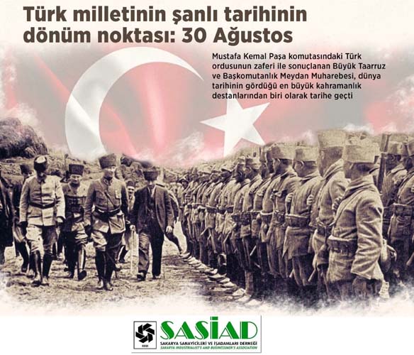 30 Ağustos'un dünya tarihini değiştiren, Türk ulusunun kurtuluş günü olduğunu söyleyen Sakarya Sanayicileri ve işadamları Derneği (SASİAD) Başkanı Ümit Karayaka, umudu bu topraklarda bağımsızlık ateşi ile tekrar yeşerten Gazi Mustafa Kemal Atatürk 'e çok şey borçlu olduklarını belirtti.