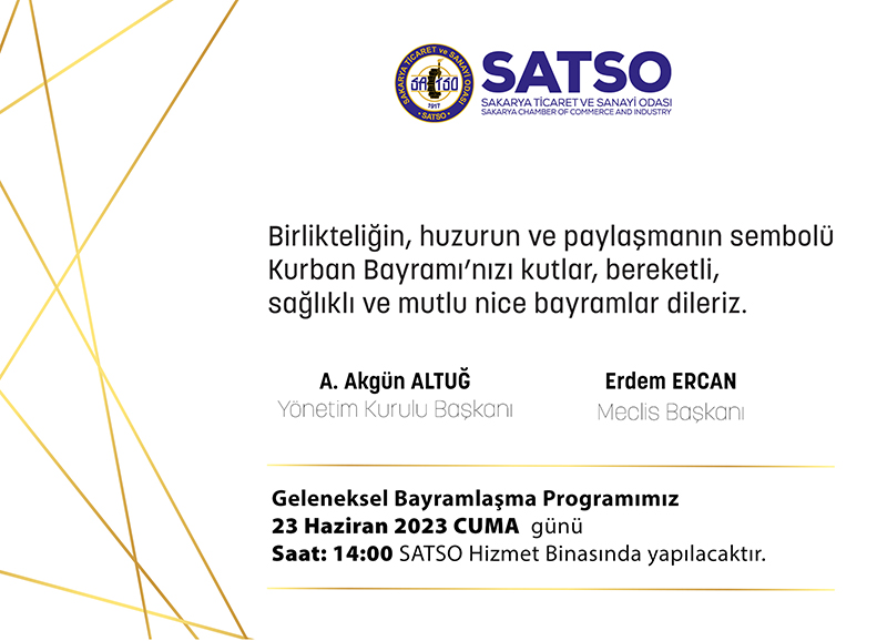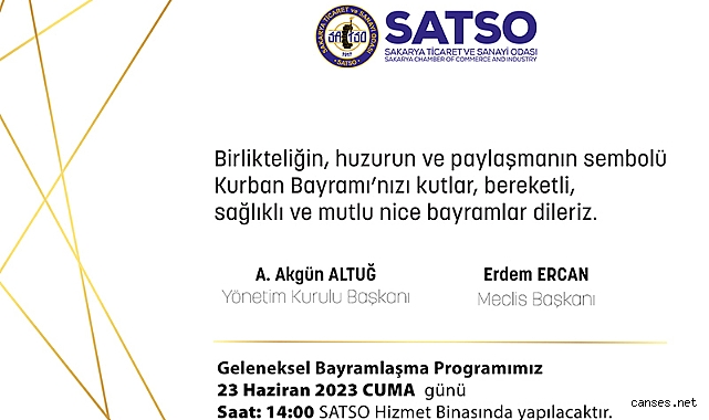 SATSO Yönetim Kurulu Başkanı A. Akgün Altuğ, Meclis Başkanı Erdem Ercan ve Yönetim Kurulu Üyelerinin ev sahipliğinde il protokolü ve SATSO üyelerinin katılımı ile gerçekleştirilecek Geleneksel Bayramlaşma Töreni 23 Haziran Cuma günü saat 14.00’de SATSO Hizmet Binası Fuaye Alanı’nda yapılacak.