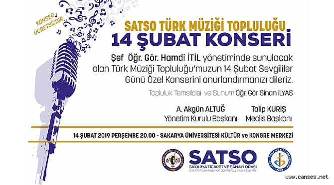 10 yılı aşkın süredir çalışmalar yapan koro; 14 Şubat 2019 Perşembe akşamı Sakarya Üniversitesi Kültür ve Kongre Merkezi’nde Türk Müziğinin eşsiz eserlerini Sakaryalılarla paylaşacak. Saat 20,00’de başlayacak SATSO Türk Müziği Topluluğu 14 Şubat Özel Konseri’ne tüm Sakaryalılar davetlidir.