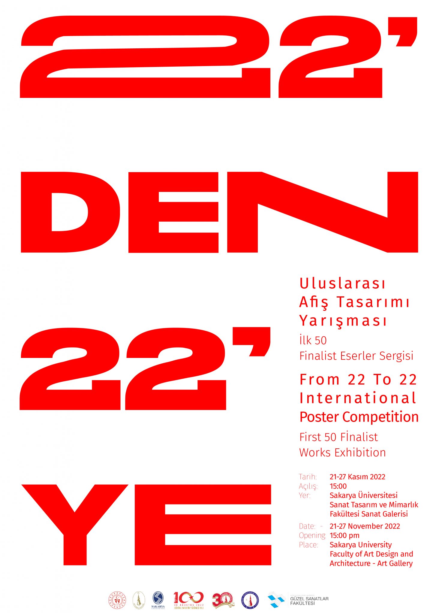 21 Kasım 2022’de Sakarya Üniversitesi Sanat Tasarım ve Mimarlık Fakültesi’nde düzenlenecek “22’den 22’ye” temalı “Uluslararası Afiş Tasarımı Yarışması” sergisinin açılışını Sakarya Üniversitesi Rektörü Prof. Dr. Hamza Al ve Dumlupınar Üniversitesi Rektörü Prof. Dr. Kazım Uysal gerçekleştirecek.
